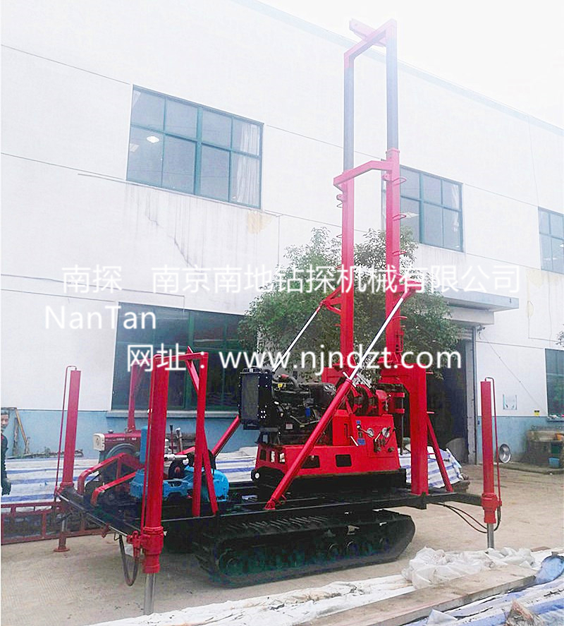 钻机机组由履带底盘、柴油机、升高型液压支腿、钻机、液压起落钻塔组成,共同组装在一个机架上。钻机可以选择柴油机或电动机、履带底盘及液压支腿由独立柴油机带动、互不干涉。