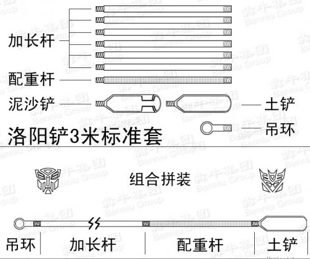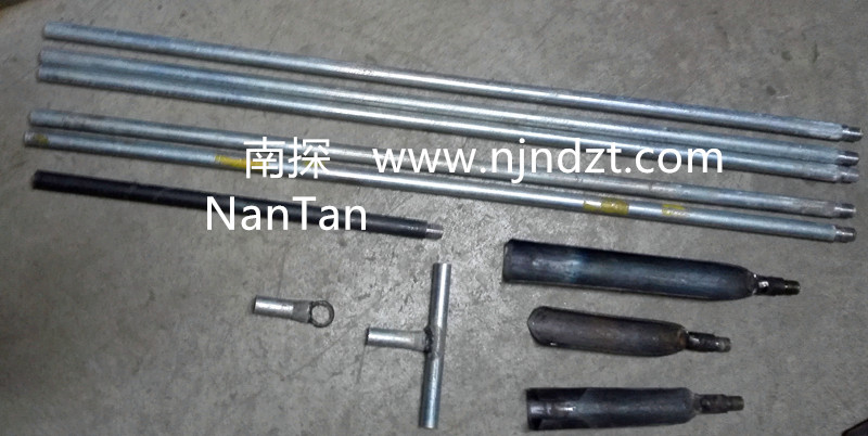 一段有柄,可以接长的。使用时垂直向下戳击地面,可深逾20米,利用半圆柱形的铲可以将地下