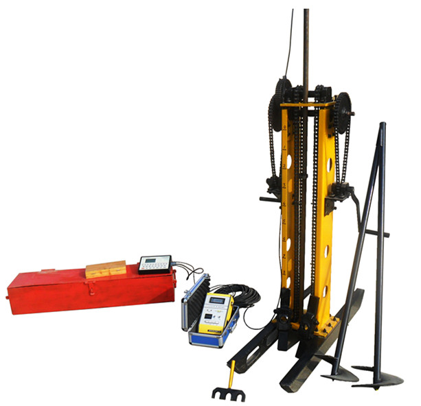 该机可进行土质地基的承载能力或抗剪强度测试,测量地基土的比贯入阻力Ps、锥尖阻力Qc(双桥)、侧摩擦力Fs;也可进行电测十字板剪切试验,求饱和软粘土的不排水抗剪强度Cu,从而为地基基础的设计提供参数(需要配置蜗杆装置、传感器、十字板头)。