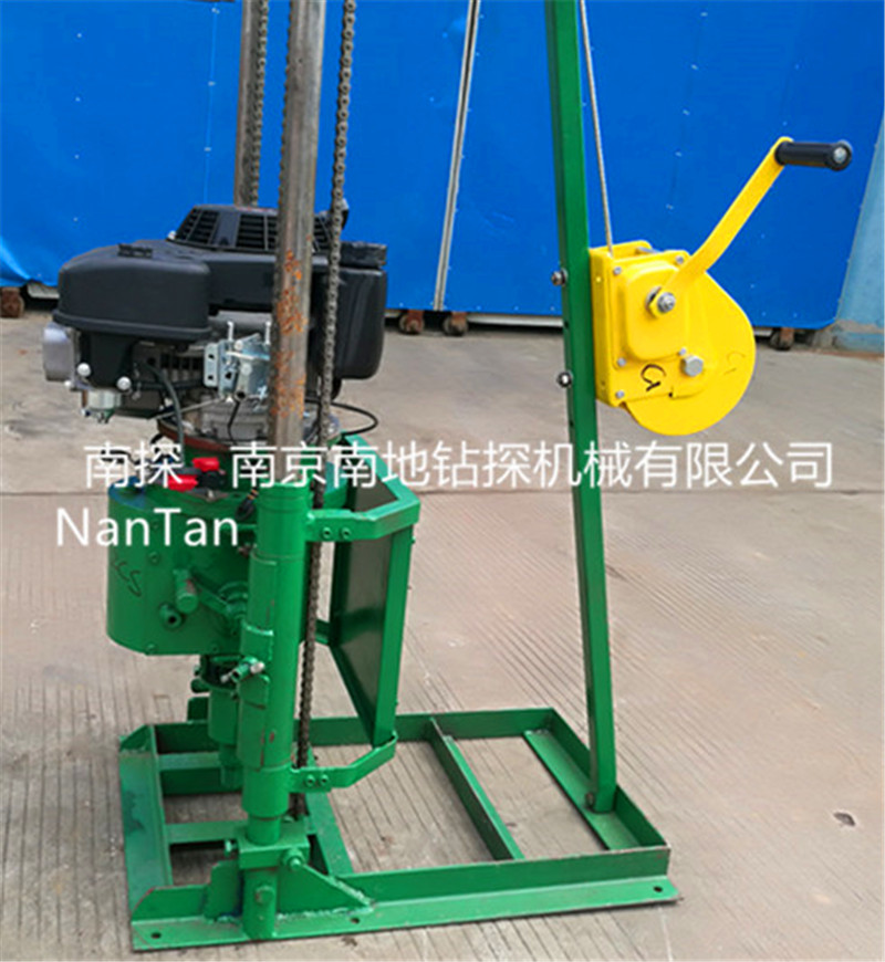 可以2人操作的取芯钻机!钻探深度可达30米!采用轻便的汽油机(或电动机可选)作为动力,分体式轻便实用,搬迁十分便利,带支架稳定可靠,满足野外车辆无法进入地区时用;钻机操作简单,易学易懂。可实现合金、金刚石钻头钻进及麻花螺旋钻进和不取芯三叶合金钻头、复合片不取芯钻头引孔钻进的需求。