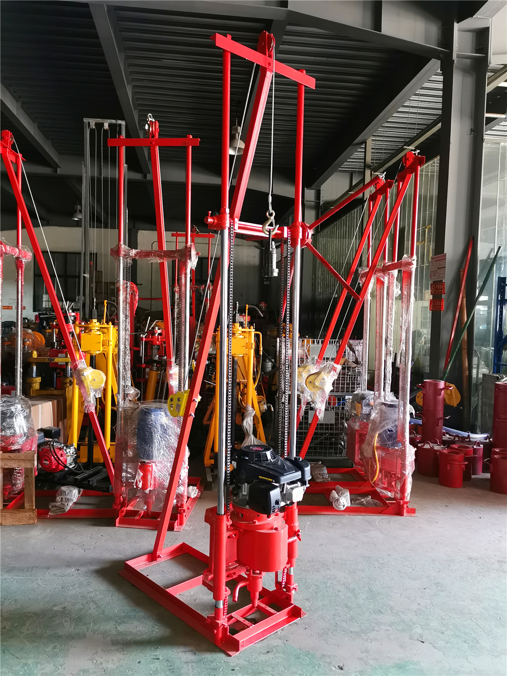 可以2人操作的取芯钻机!钻探深度可达30米!采用轻便的汽油机(或电动机可选)作为动力,分体式轻便实用,搬迁十分便利,带支架稳定可靠,满足野外车辆无法进入地区时用;钻机操作简单,易学易懂。可实现合金、金刚石钻头钻进及麻花螺旋钻进和不取芯三叶合金钻头、复合片不取芯钻头引孔钻进的需求。